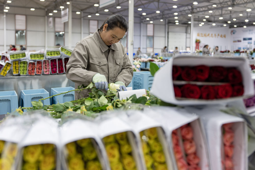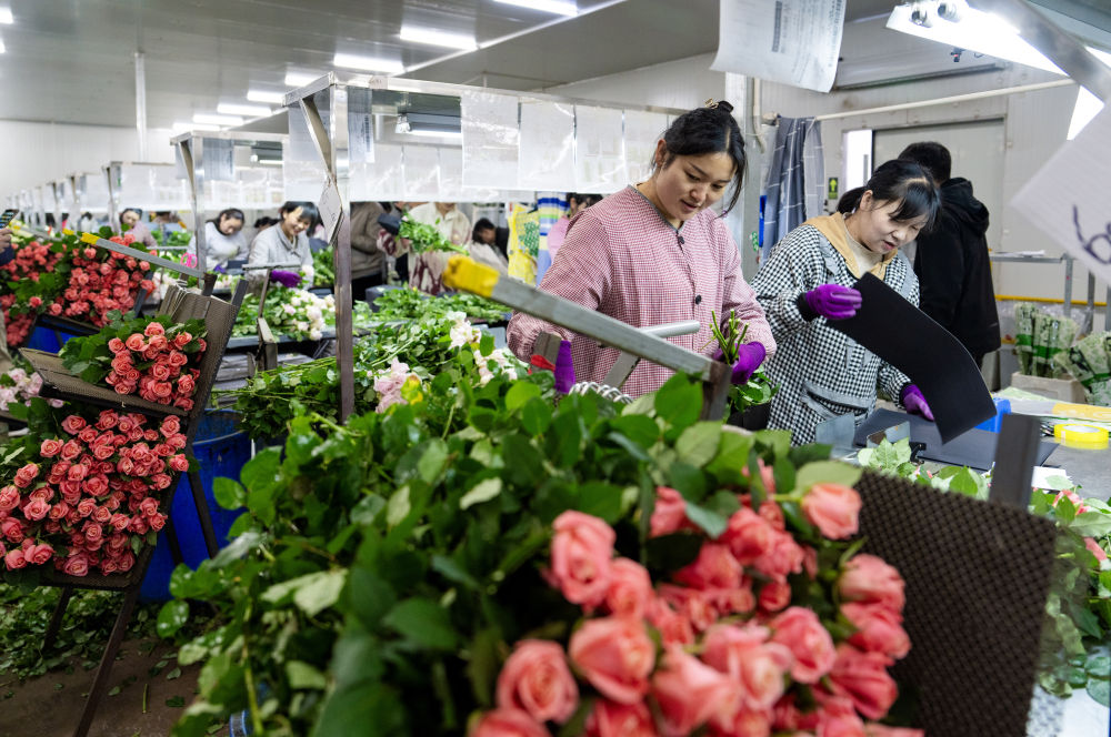 近日,花农在分拣包装车间内包装鲜花。新华社记者 陈欣波 摄