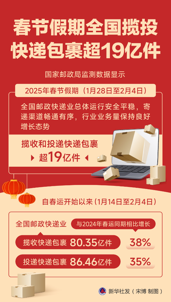 国家邮政局监测数据显示,今年春节假期(1月28日至2月4日),全国邮政快递业总体运行安全平稳,寄递渠道畅通有序,行业业务量保持良好增长态势,揽收和投递快递包裹超19亿件。