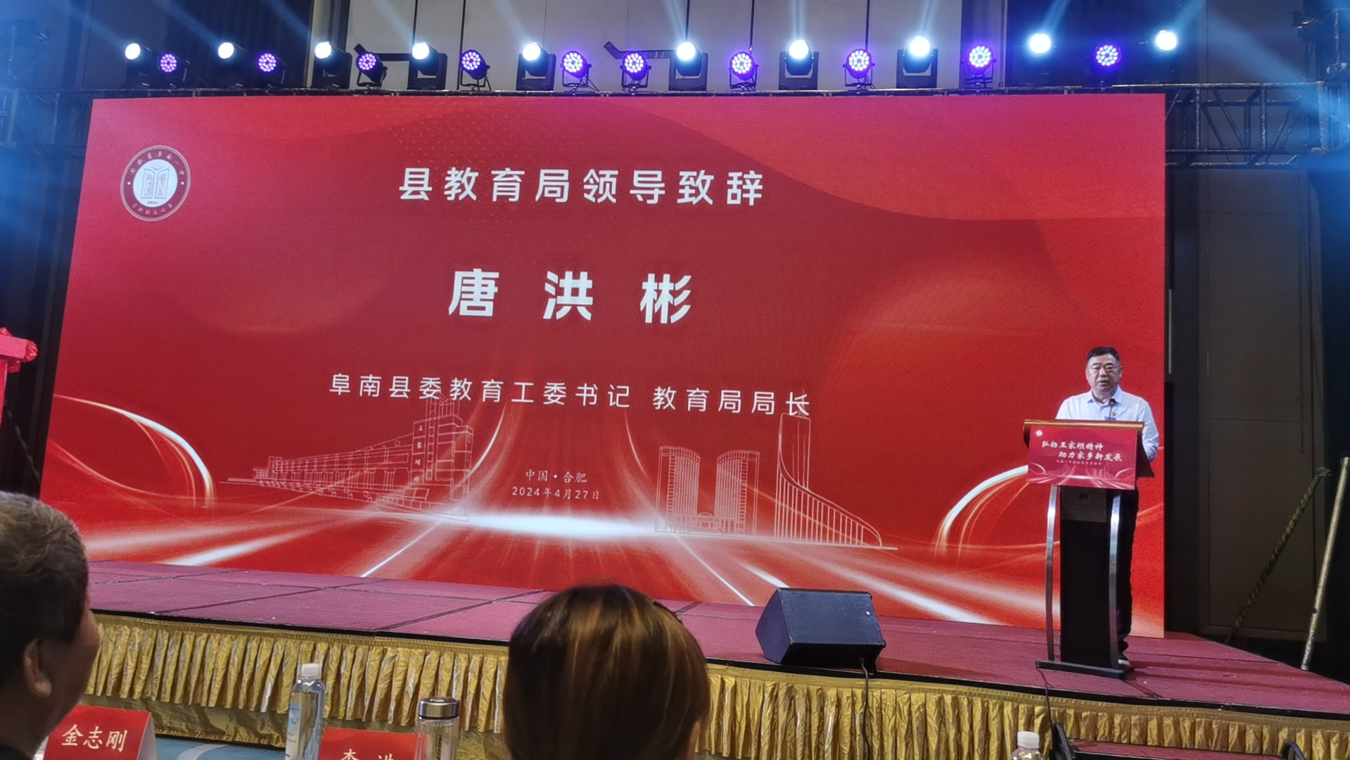 唐洪彬在致辞中表示,将继续发扬不畏艰险、不怕困难、尊重规律、干群同心的王家坝精神,以立德树人为根本任务,办好阜南教育,助力家乡新发展。