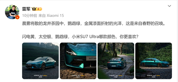 10点左右,他又发动态问网友:“小米SU7 Ultra哪款颜色,你更喜欢?”