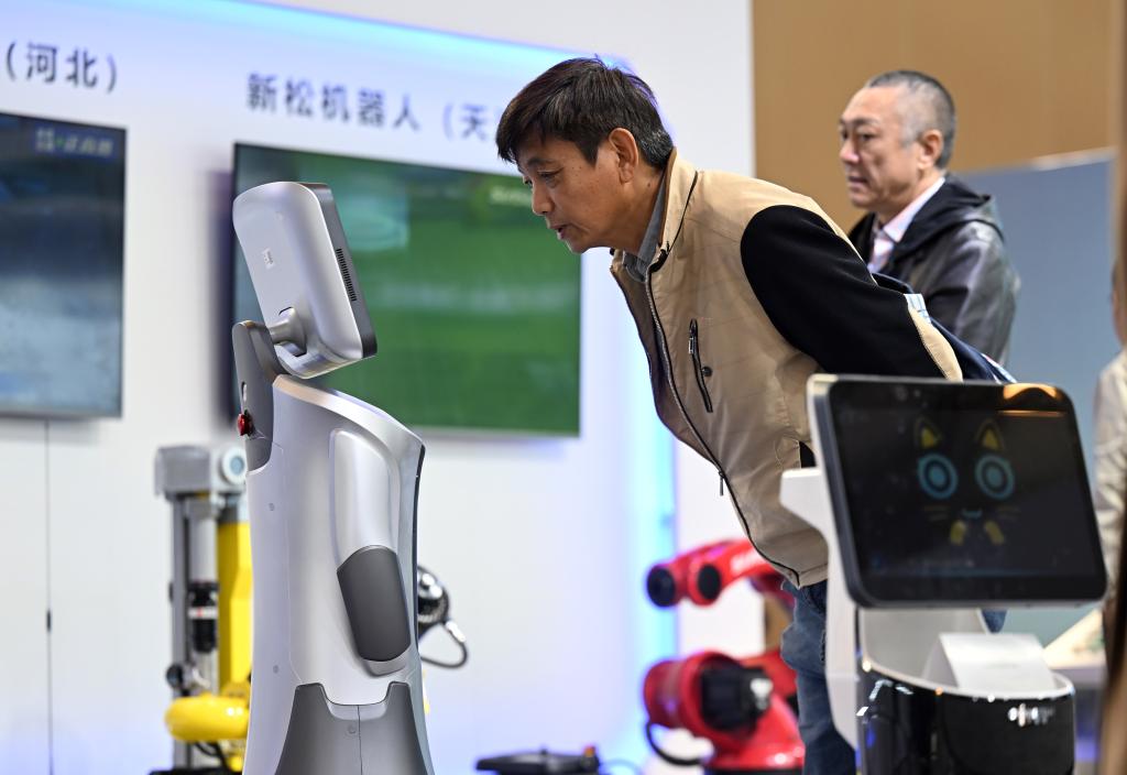 10月25日,在2024京津冀产业链供应链大会开幕式会场外设置的企业推介展区,与会嘉宾与一款服务机器人互动。新华社记者 赵子硕 摄