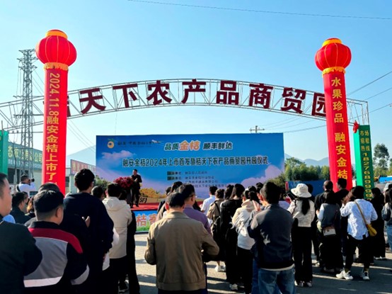 中国报道讯(王恒 报道 通讯员卫纲 龙丹 覃嘉鑫 董桂臣)11月8日,广西融安金桔正式上市!融安金桔2024年上市首发仪式在广西融安县桔天下农产品商贸园隆重举行,在仪式上,各相关部门及嘉宾共同见证了融安金桔开市盛况。融安县副县长陈远昭发表致辞并宣布融安金桔新季上市,今年第一批融安金桔正式向全国各地销售,标志着融安县这一特色农产品的新篇章正式开启。